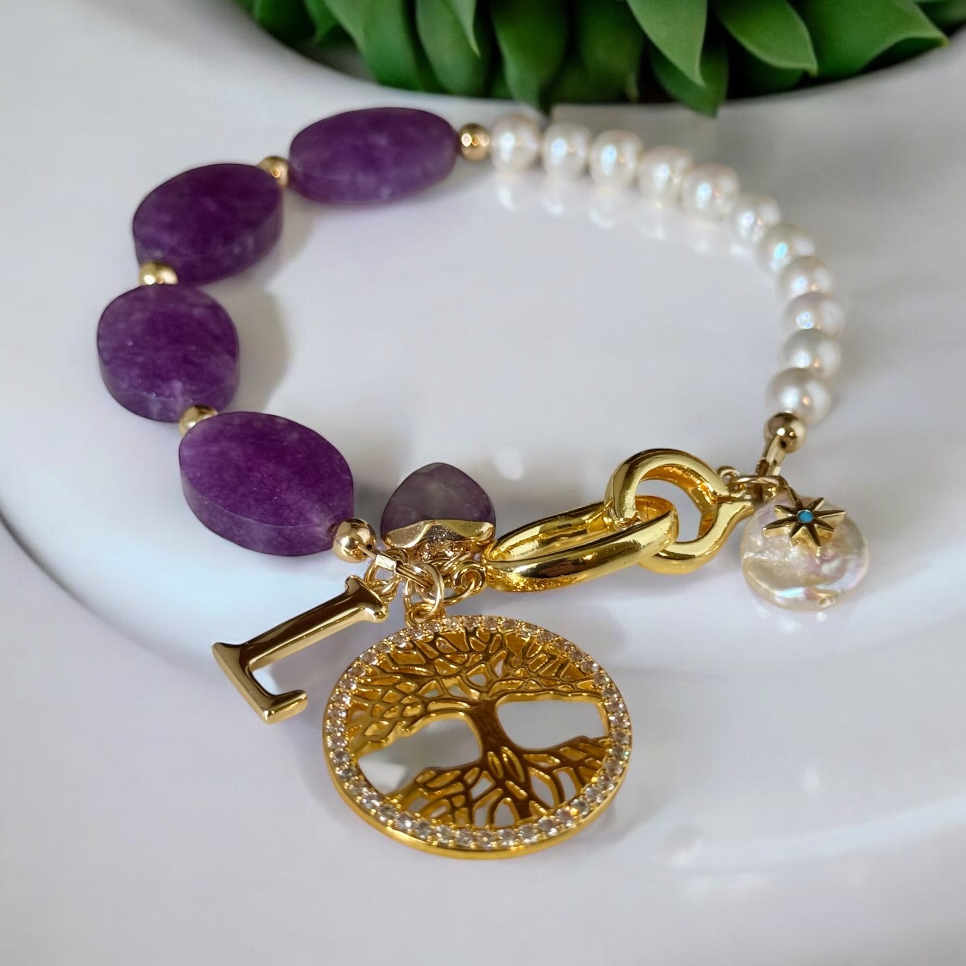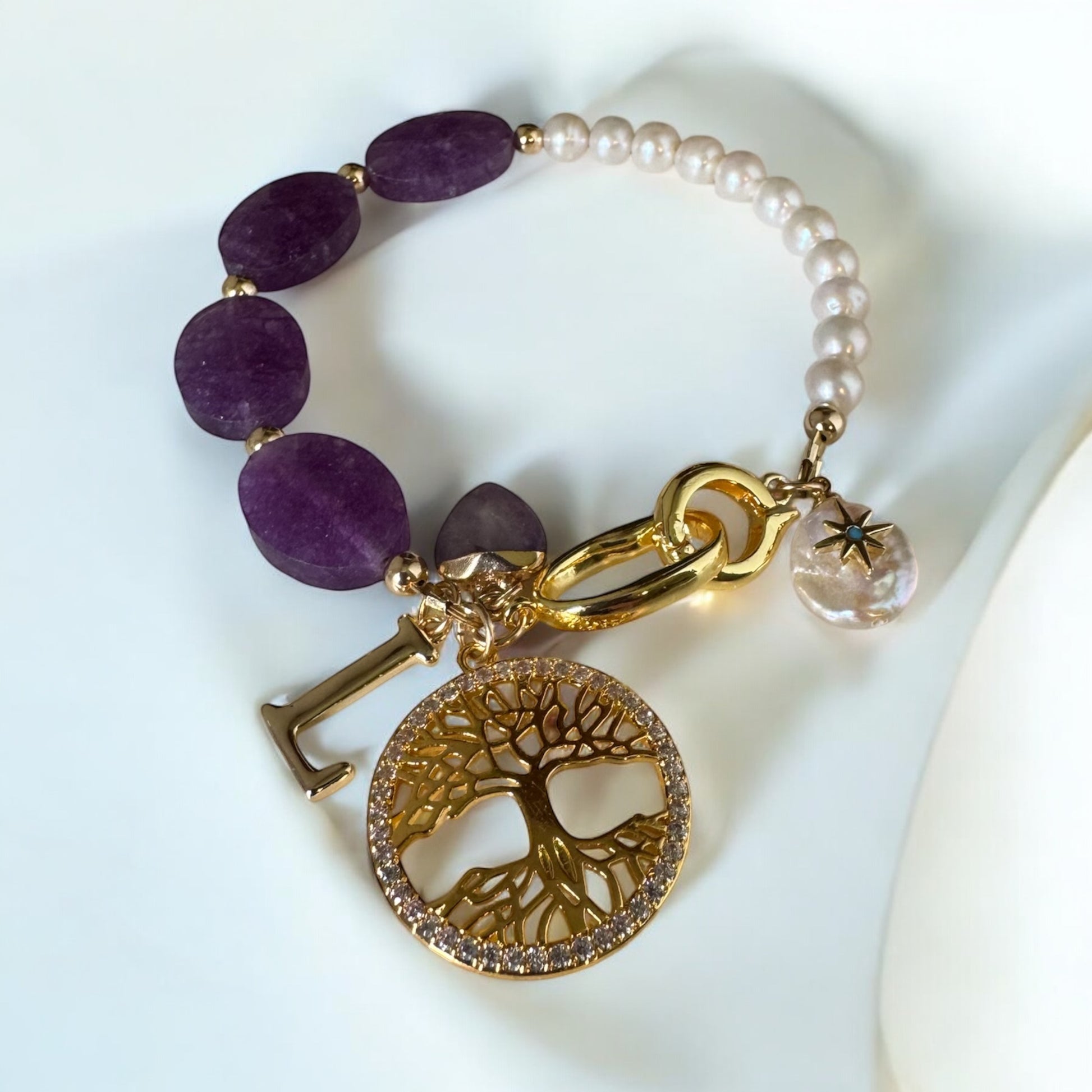 The bracelet combines natural purple amethyst beads, known for their calming and protective energy, with lustrous white freshwater pearls for a soft, elegant finish. A celestial pearl charm and a customisable initial charm add a unique, personal touch.