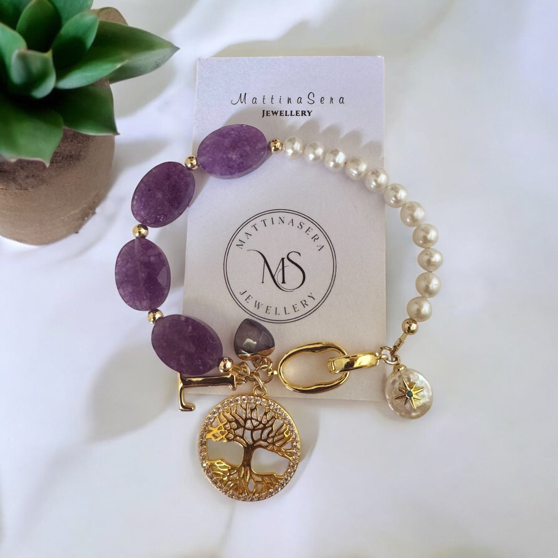 Discover timeless beauty and symbolic charm with this handcrafted amethyst and freshwater pearl bracelet, designed to inspire elegance and inner balance. Featuring a stunning 18K gold-plated Tree of Life charm, this piece embodies growth, strength, and spiritual connection.