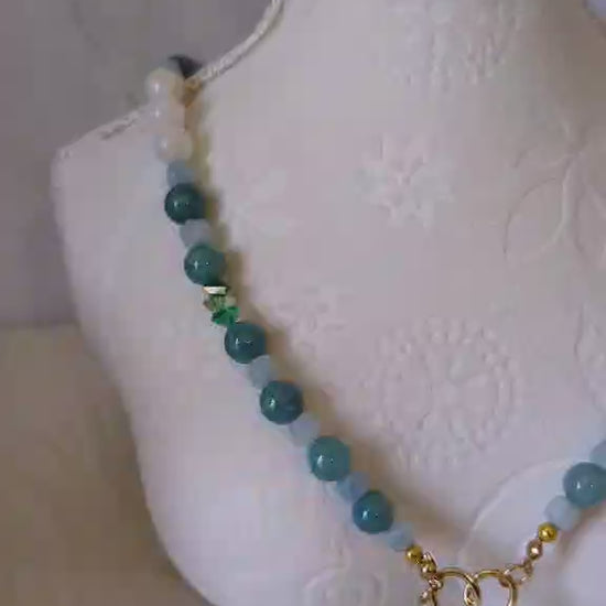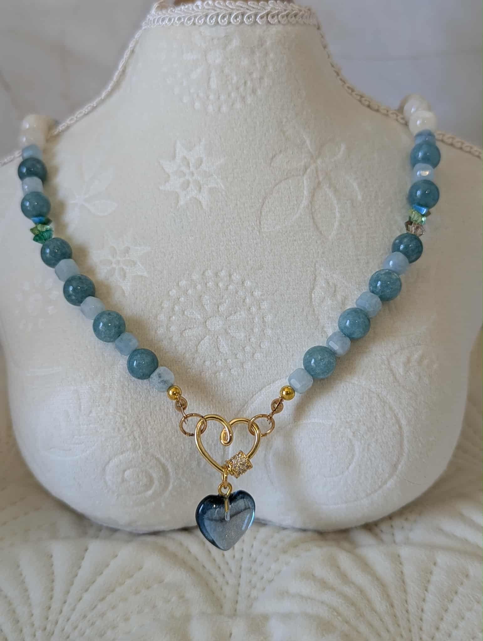 Embrace serene blue hues with our handmade aquamarine and moonstone necklace, featuring 8mm natural gemstone beads and a delicate transparent glass blue heart pendant. A perfect blend of elegance and tranquillity, this piece radiates soft, calming energy, making it ideal for everyday wear or special occasions.