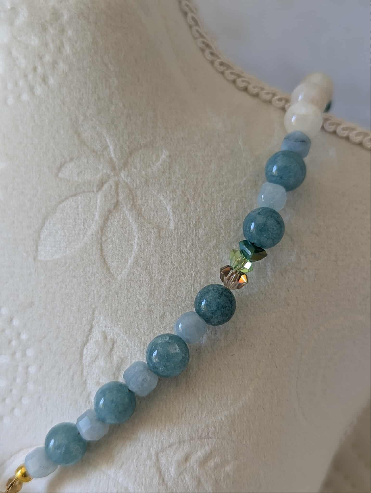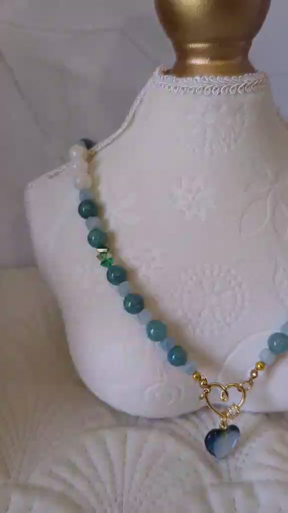 Natural Aquamarine & Moonstone Necklace with Glass Blue Heart