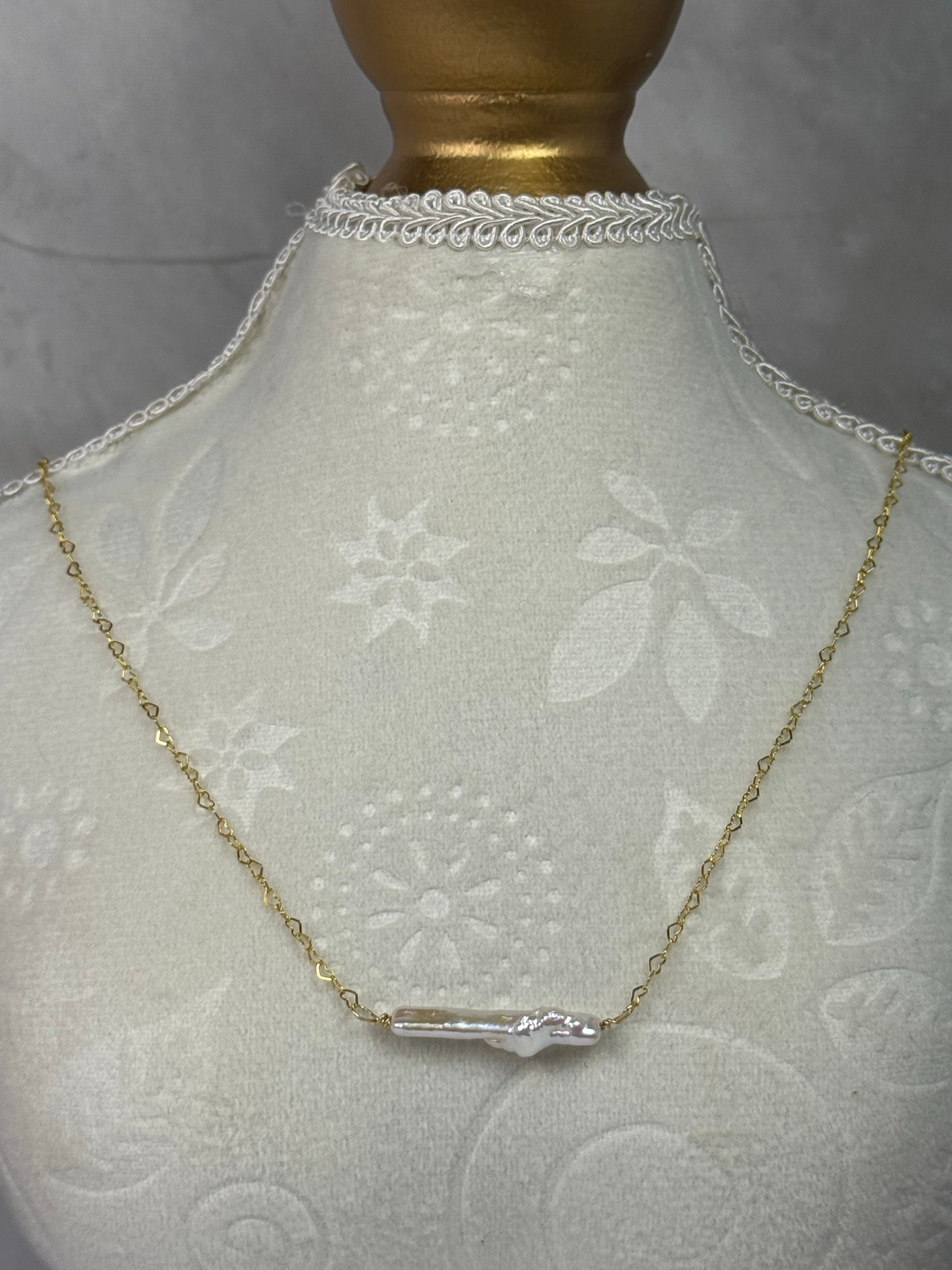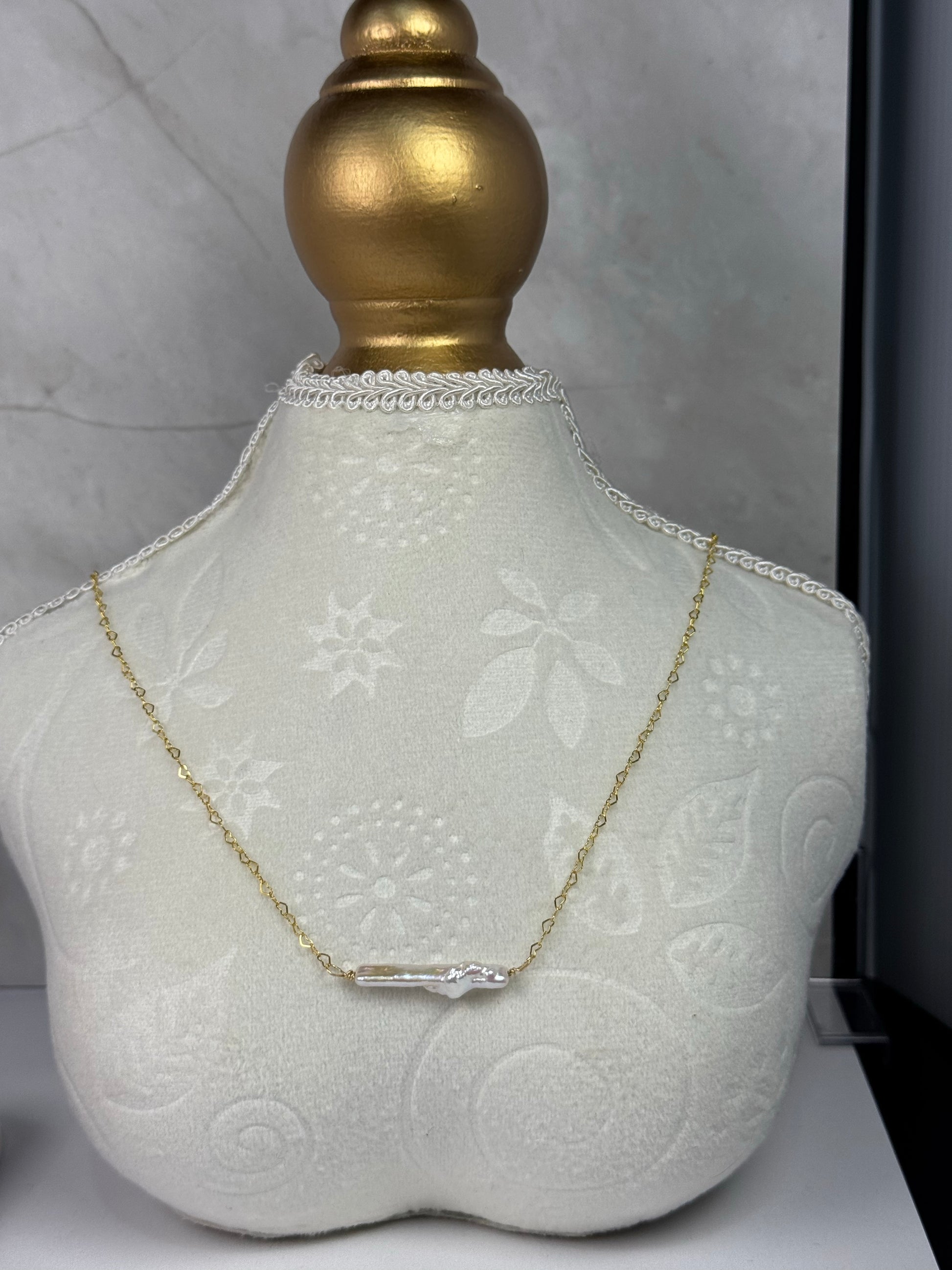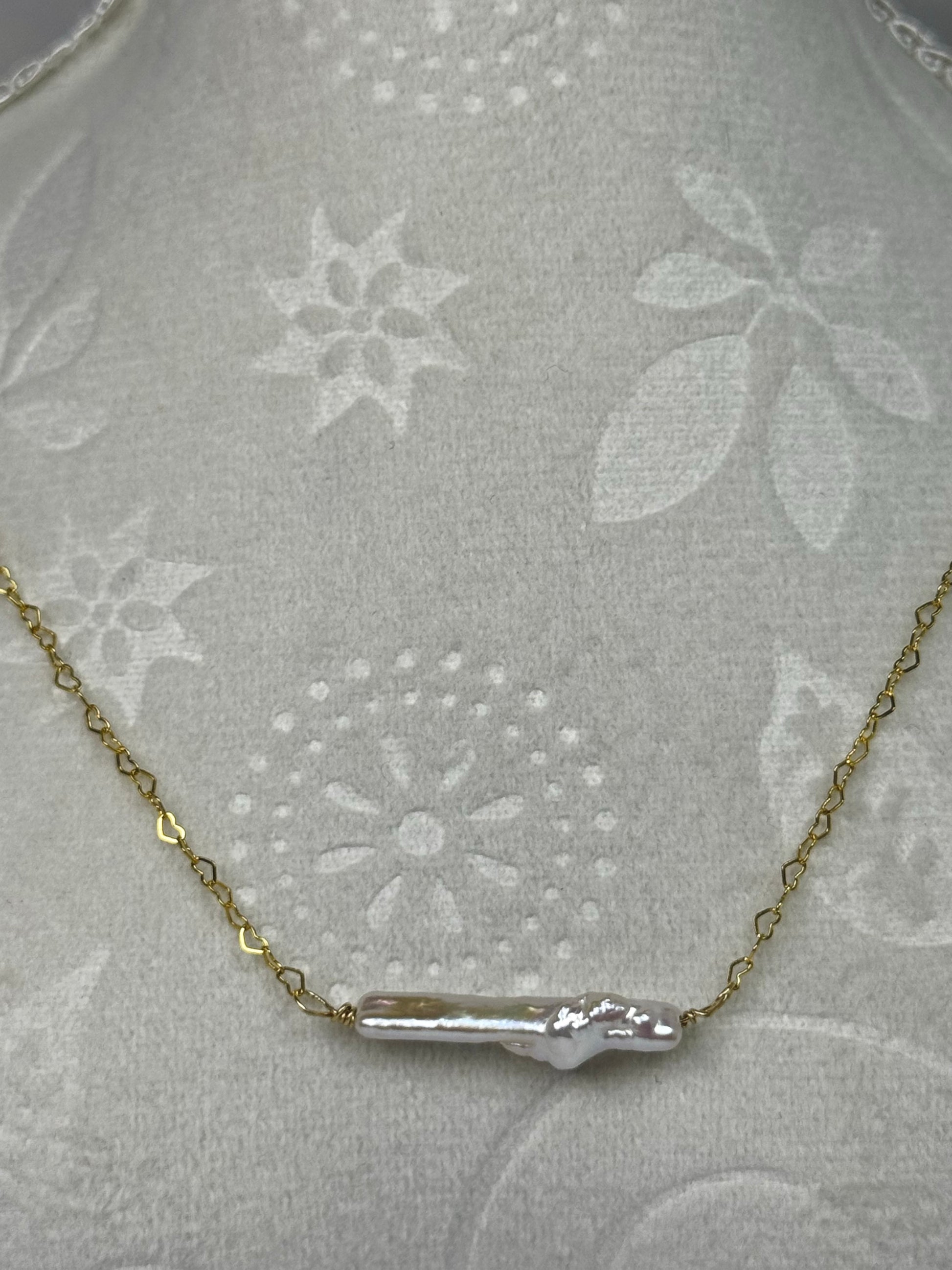 This Delicate handmade pearl necklace features a Biwa Freshwater Baroque Pearl, known for its long, organic shape and natural lustre. Each Pearl is completely on of a kind, making your piece as unique as you are.