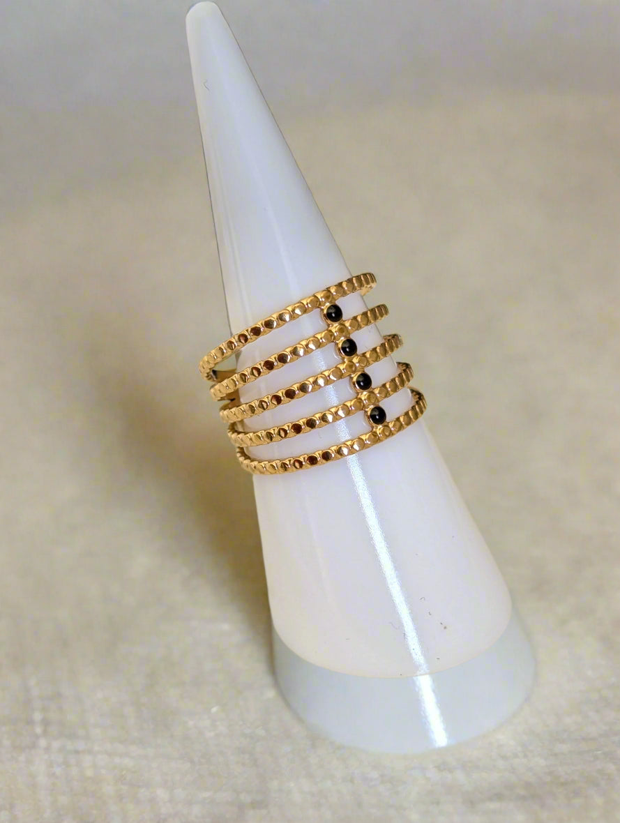 Bold meets elegance in this eye-catching 18K gold plated ring, crafted from durable stainless steel. Featuring a unique layered design with textured bands and four striking black stone accents, this piece makes a powerful statement on its own or styled with other favourites.