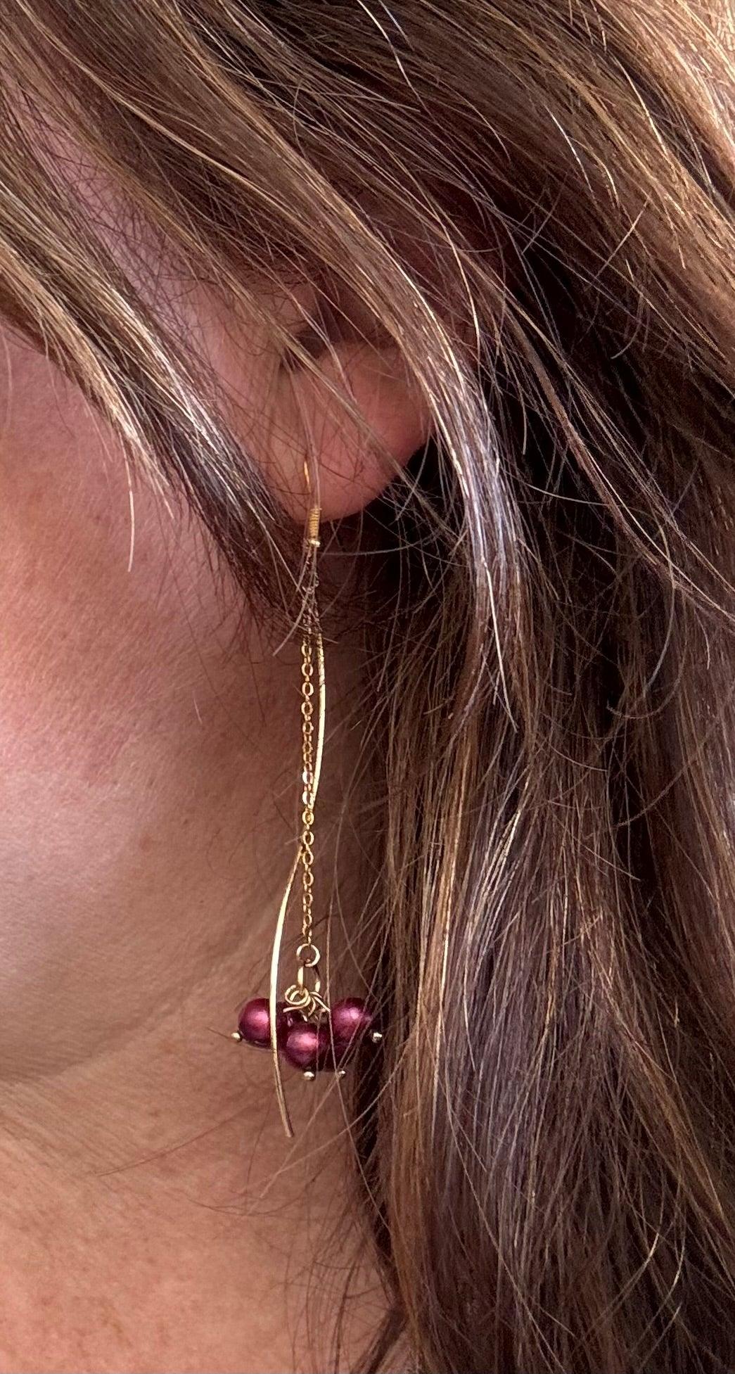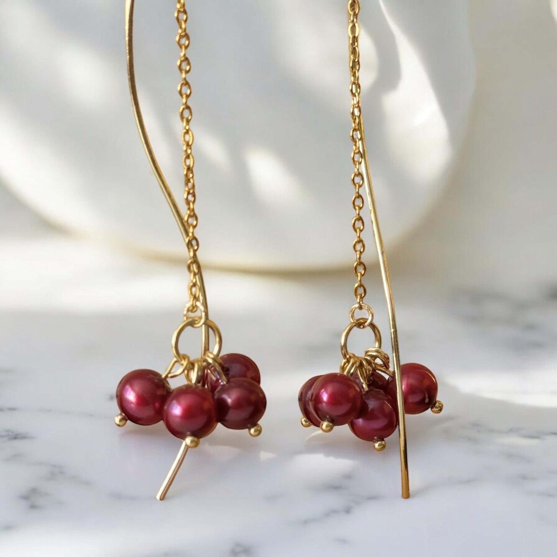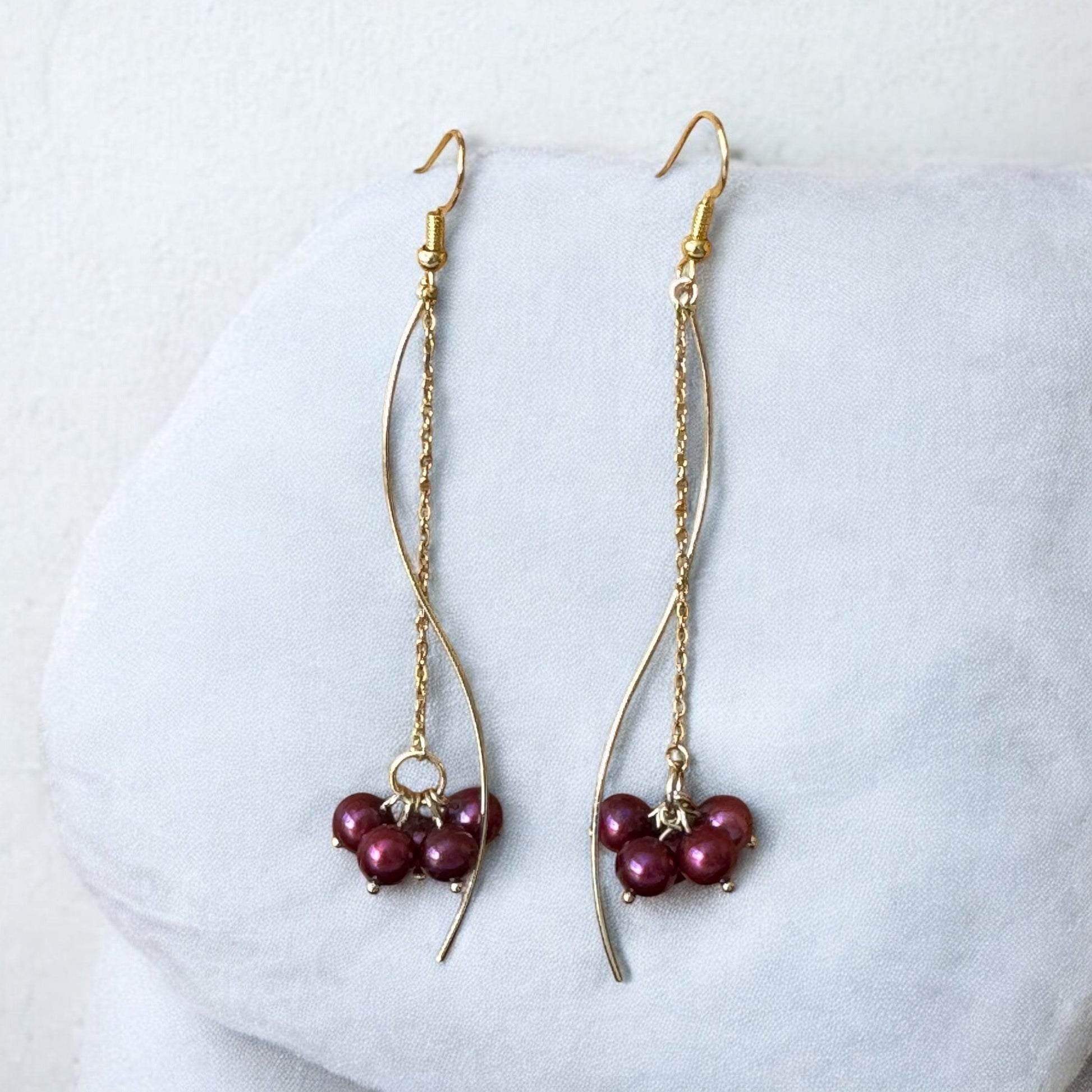 Add a touch of timeless elegance to your bridal ensemble with these Deep Garnet Pearl Dangle Earrings, perfect for weddings, special occasions, or everyday sophistication. Featuring lustrous deep garnet freshwater pearls (approximately 3-4mm), these earrings gracefully dangle from gold vermeil ear wires, complemented by a delicate gold chain and a sleek, swirling accent for added movement. Their 7cm length creates a flattering, elongated effect, making them an ideal choice for brides, bridesmaids, or wedding guests seeking a refined, modern touch.