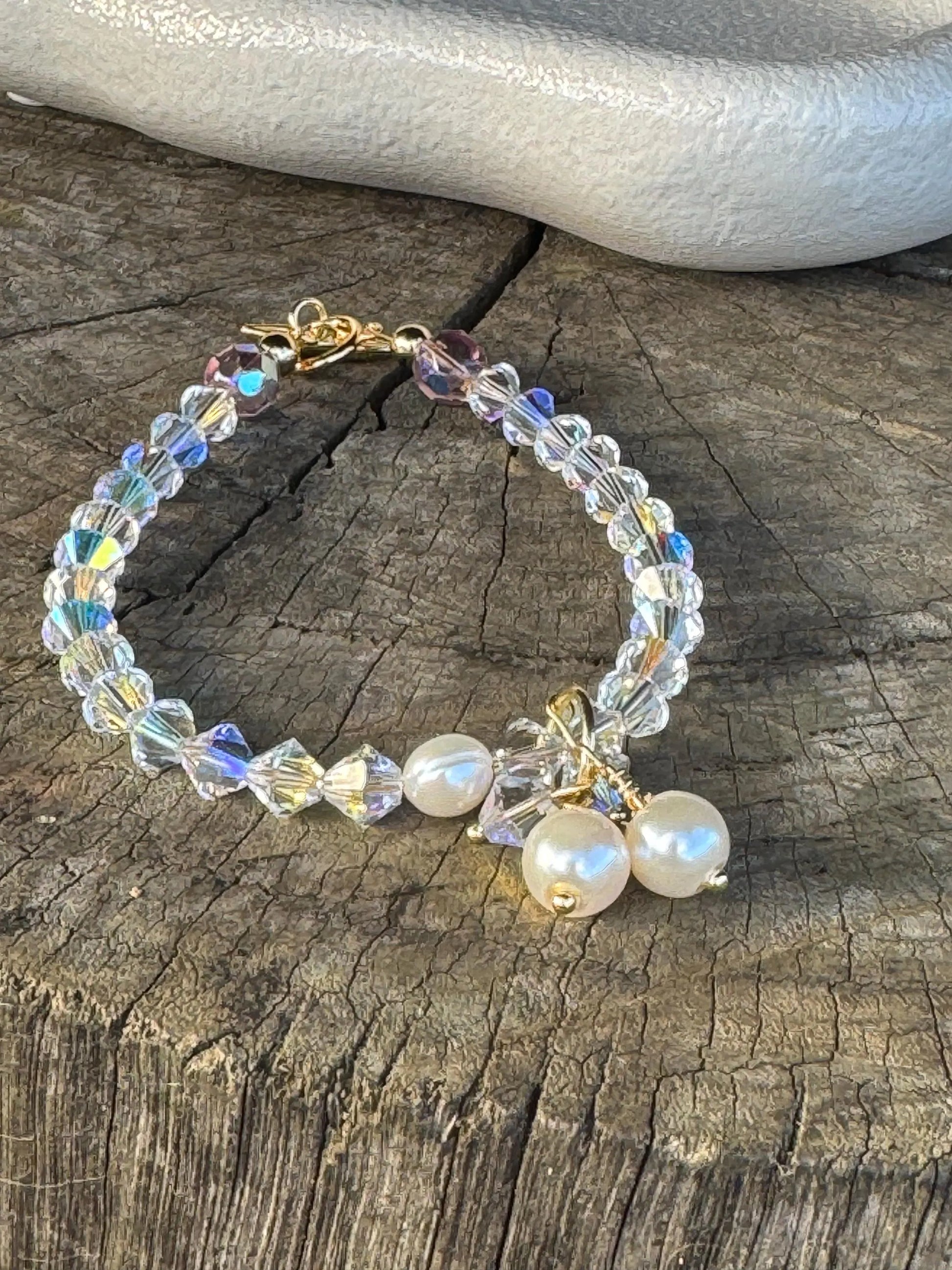Add timeless elegance to your jewellery collection with this handmade crystal and pearl bracelet, crafted to sparkle with every movement.