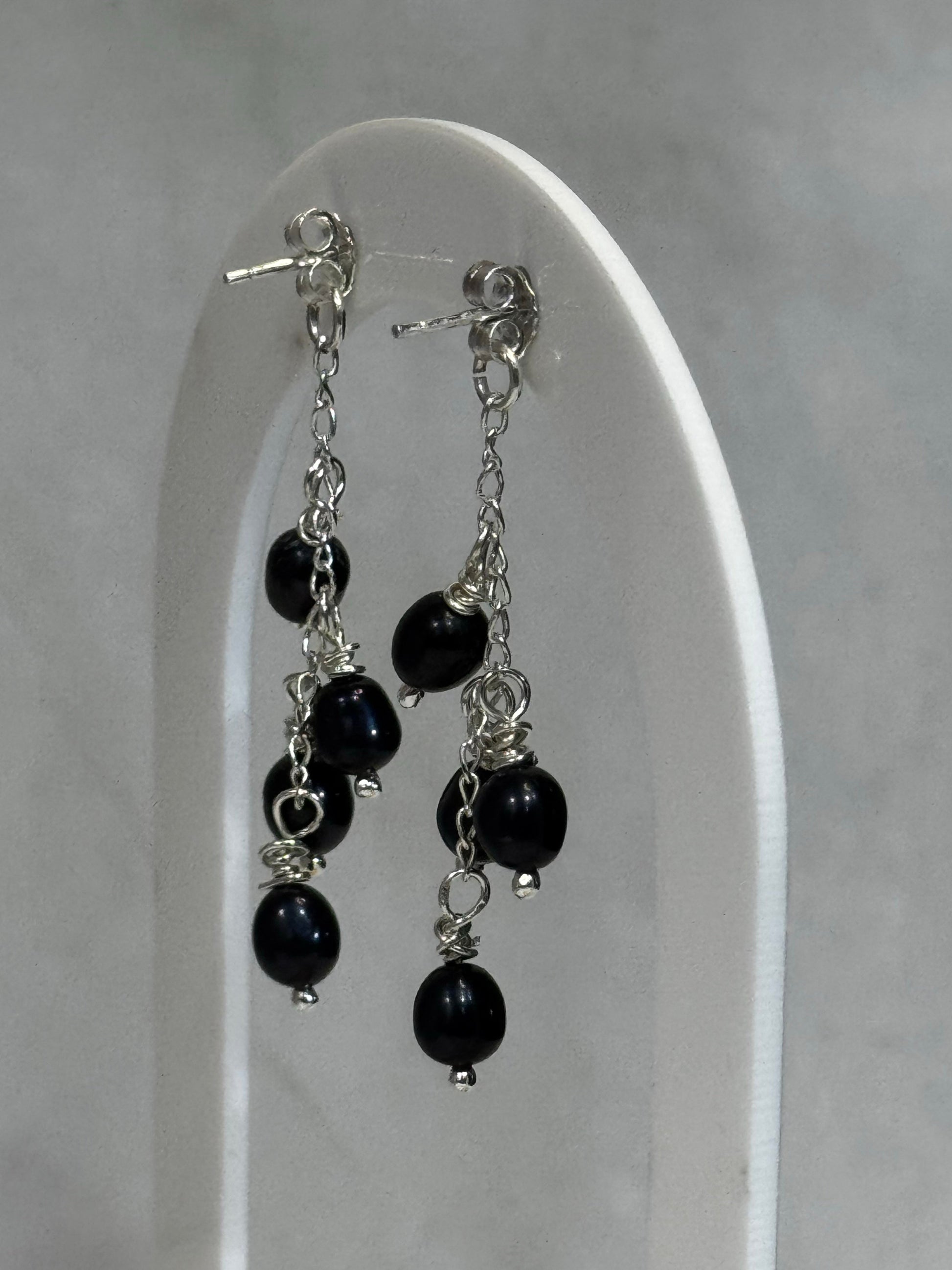 The design includes a black pearl stud with four additional pearls cascading from a delicate sterling silver chain, creating graceful movement and a distinctive double-sided drop effect. Perfect for those seeking a statement piece that combines timeless elegance with modern artistry.