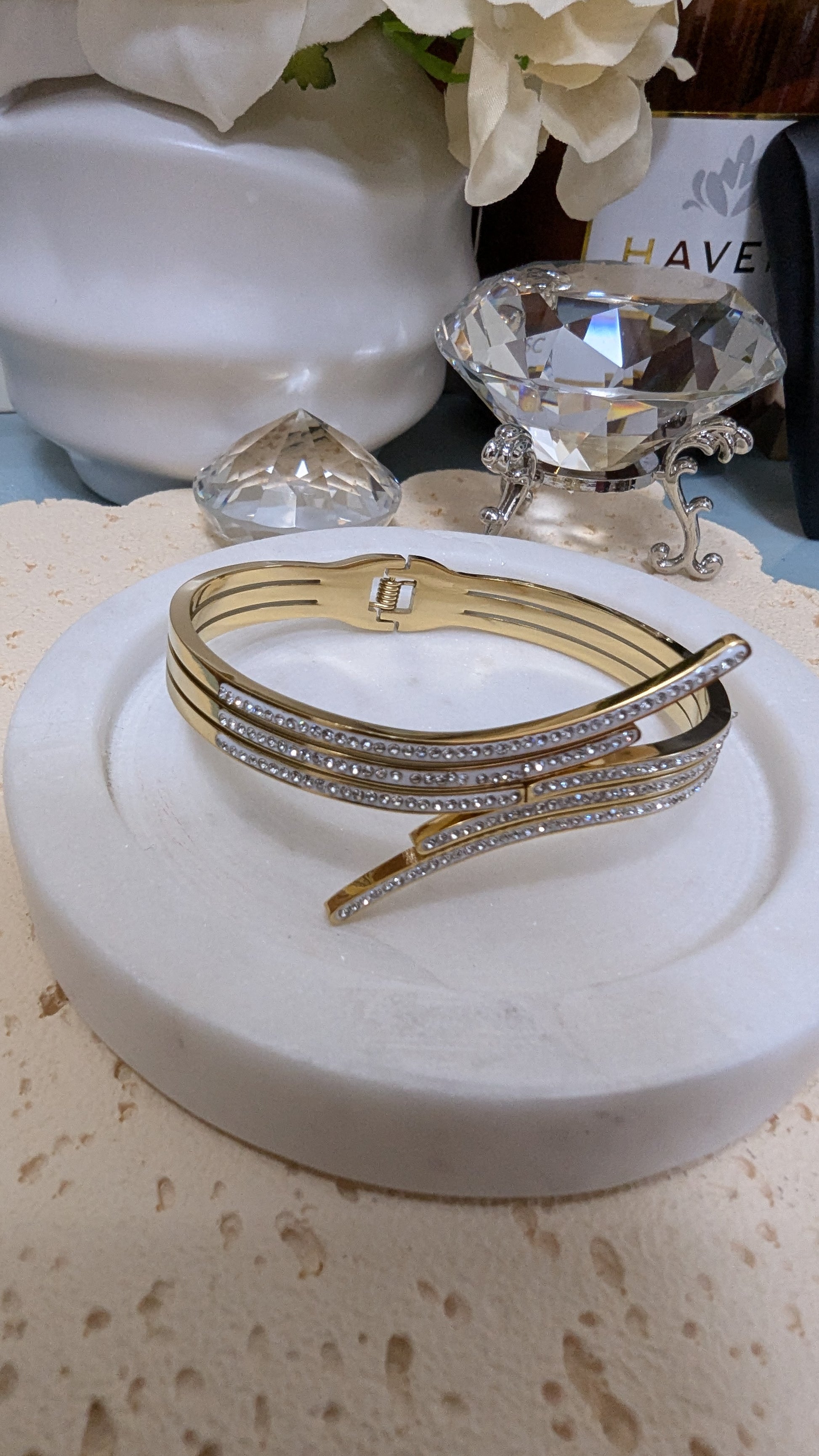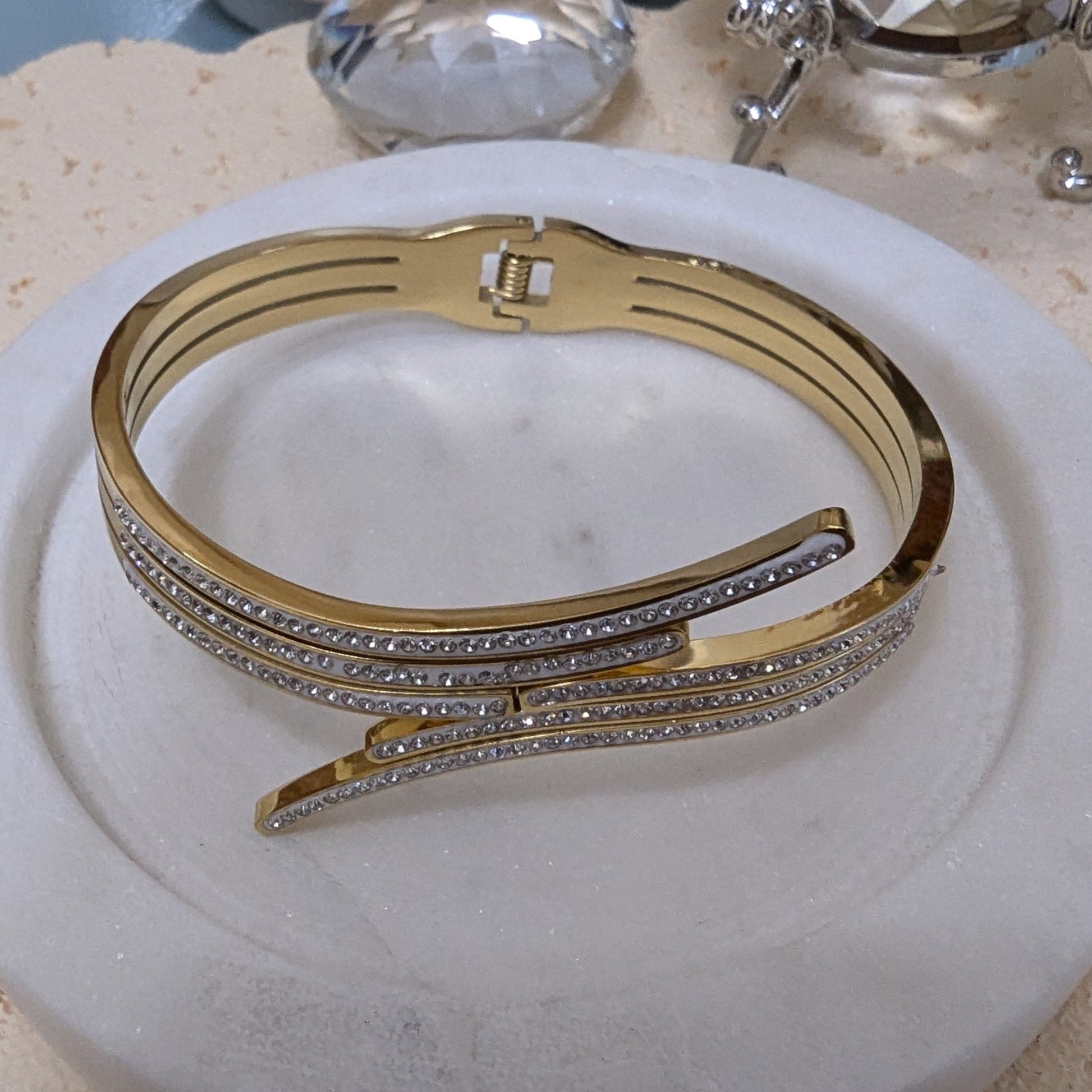 Crafted from durable stainless steel and plated in radiant 18K gold, this luxurious cuff features a unique crossed silhouette adorned with shimmering rhinestones along every curve. The triple-row detailing adds maximum sparkle, while the sleek easy open and close function ensures a secure and comfortable fit for all-day elegance.