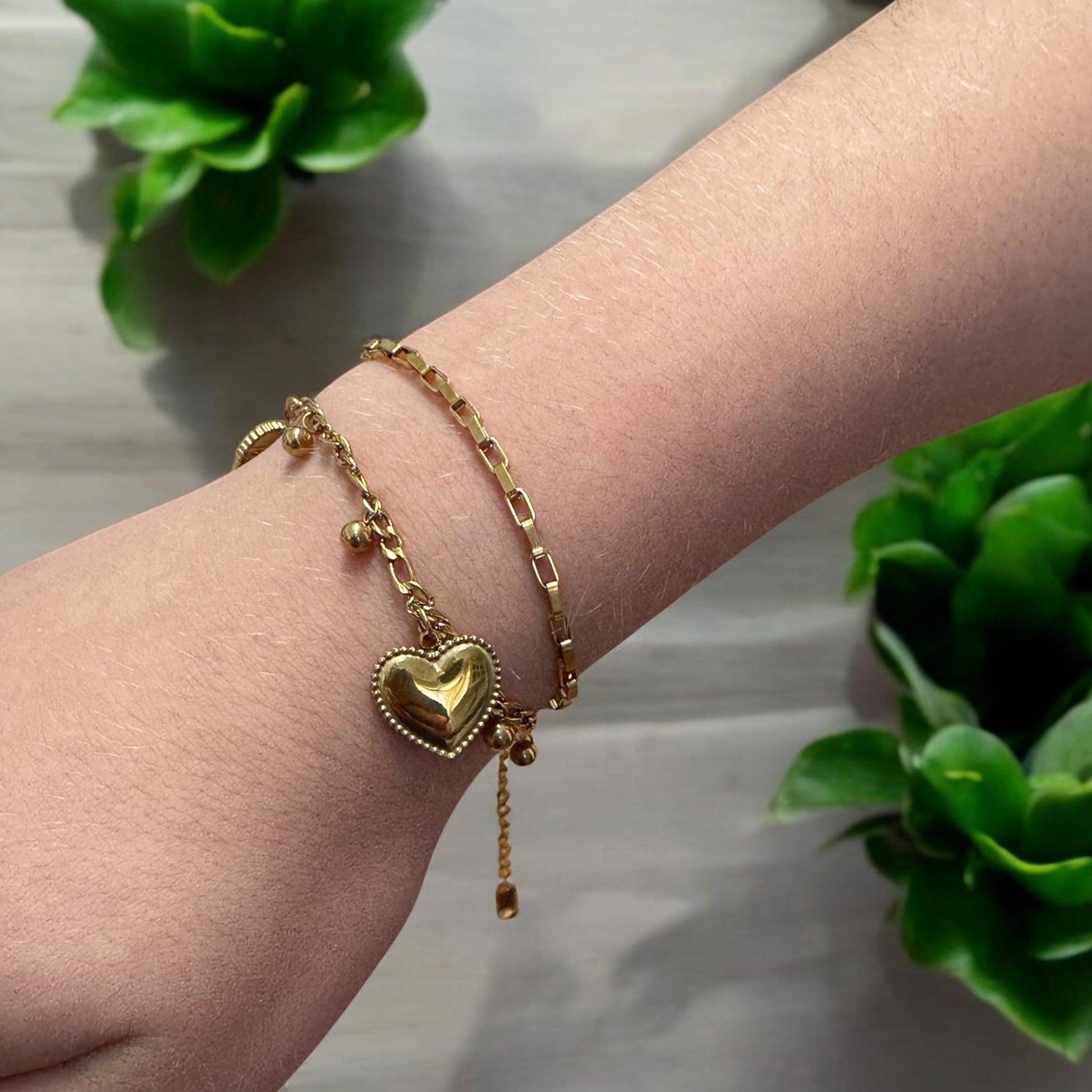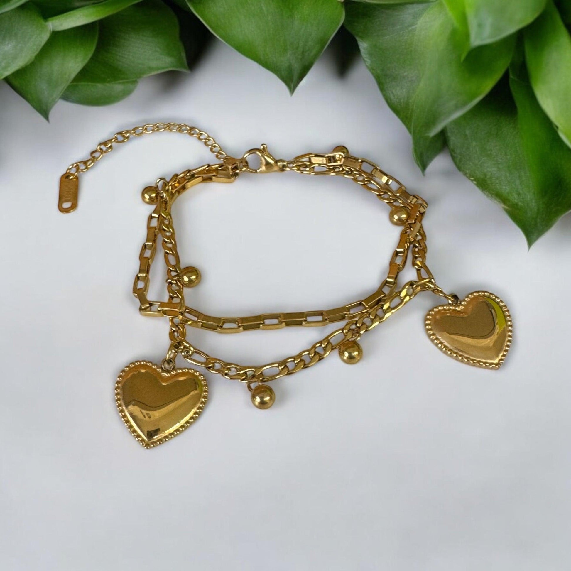 Featuring a delicate yet bold design, this bracelet combines a stylish mix of chunky box chains and dainty link chains, adorned with mini gold beads and two elegant heart charms. Whether worn alone or stacked, it’s the perfect accessory to add a touch of elegance to any outfit.